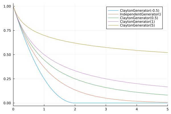plot!(x -> ϕ(ClaytonGenerator(5),x), label="ClaytonGenerator(5)")