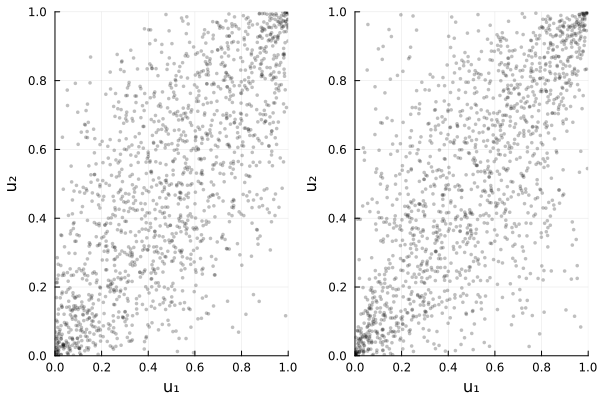 C = TCopula(ν,Σ)TCopula{2, 3, Matrix{Float64}}(Σ = [1.0 0.5; 0.5 1.0]))You can sample it and compute its density and distribution functions via the standard interface. We could try to fit a GaussianCopula on the sampled data, even if we already know that the tails will not be properly taken into account:
