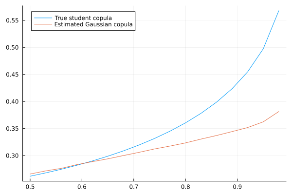 Ĉ = fit(GaussianCopula,u) # to fit on the sampled data.GaussianCopula{2, Matrix{Float64}}(Σ = [1.0000000000000002 0.5060302945989829; 0.5060302945989829 1.0]))We see that the estimation we have on the correlation matrix is quite good, but rest assured that the tails of the distributions are not the same at all. To see that, let's plot the lower tail function (see [3]) for both copulas: