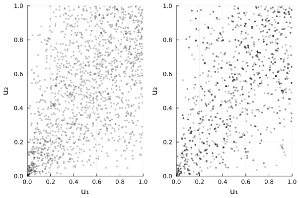 u::d×n(raw or pseudos):Ĝ = EmpiricalGenerator(u; pseudo_values=true)Use directly in an Archimedean copula: