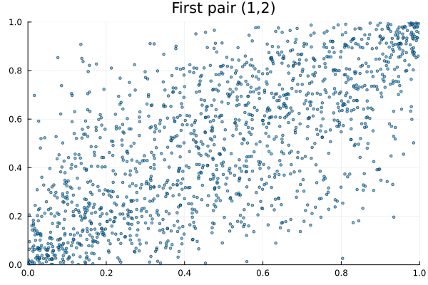 scatter(U[1,:], U[2,:]; ms=2, alpha=0.6, xlim=(0,1), ylim=(0,1), title="First pair (1,2)", legend=false)