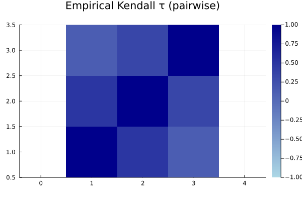 heatmap(τ; title="Empirical Kendall τ (pairwise)", aspect_ratio=1, c=:blues, clim=(-1,1))