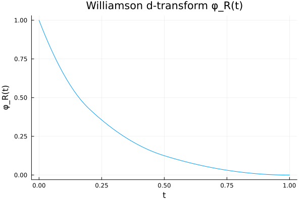 plot(ts, ϕᵣ.(ts), xlabel="t", ylabel="φ_R(t)", title="Williamson d-transform φ_R(t)", legend=false)