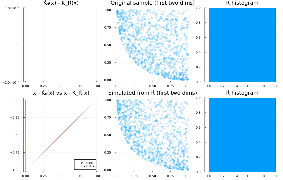 This example recalls and implements a practical, nonparametric way to estimate the radial (mixing) distribution R that underlies a d-Archimedean copula by inverting a link between the kendall distribution and the radial part [41] [42], and applying this inversion to the empirical Kendall distribution. Suprisingly, a triangular recursion appears that maps empirical kendall atoms to radial atoms: see, in particular, [36]. We’ll: