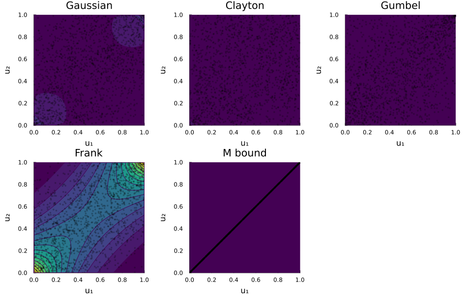 labels = ("Gaussian", "Clayton", "Gumbel", "Frank", "M bound")