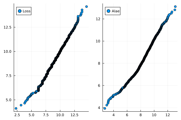 scatter(sort(log.(alae)), log.(quantile.(Ref(fit_clayton.m[2]),(1:n)./(n+1))), label="Alae")
