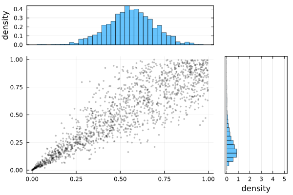 M2 = fit(CopulaModel, GumbelCopula, U; method=:mle, vcov=true, vcov_method=:bootstrap, derived_measures=false)
