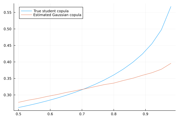 Ĉ = fit(GaussianCopula,u) # to fit on the sampled data.GaussianCopula{2, Matrix{Float64}}(Σ = [0.9999999999999999 0.5249307454482931; 0.5249307454482931 0.9999999999999999]))We see that the estimation we have on the correlation matrix is quite good, but rest assured that the tails of the distributions are not the same at all. To see that, let's plot the lower tail function (see [3]) for both copulas: