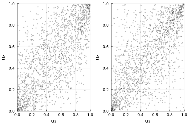 C = TCopula(ν,Σ)TCopula{2, 3, Matrix{Float64}}(Σ = [1.0 0.5; 0.5 1.0]))You can sample it and compute its density and distribution functions via the standard interface. We could try to fit a GaussianCopula on the sampled data, even if we already know that the tails will not be properly taken into account: