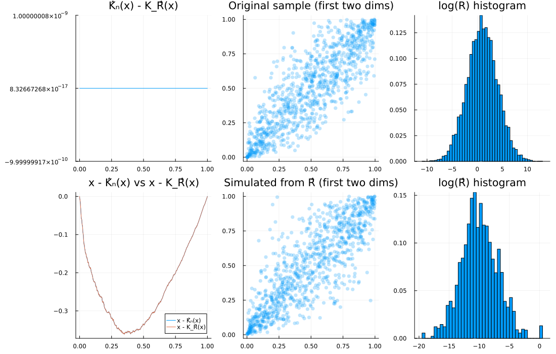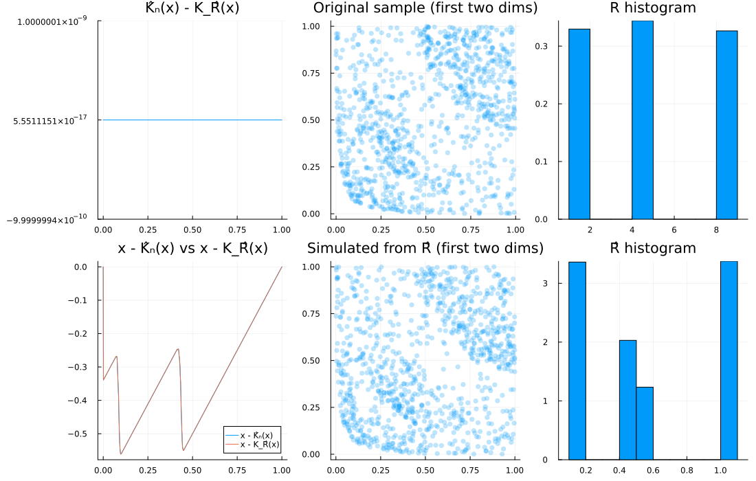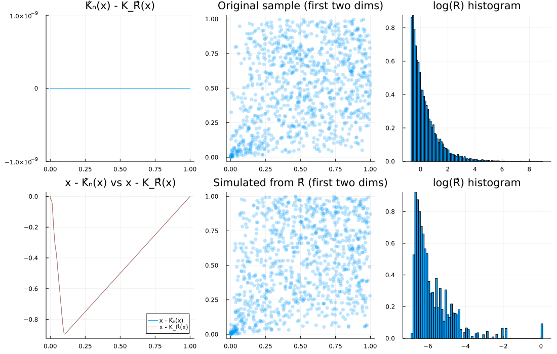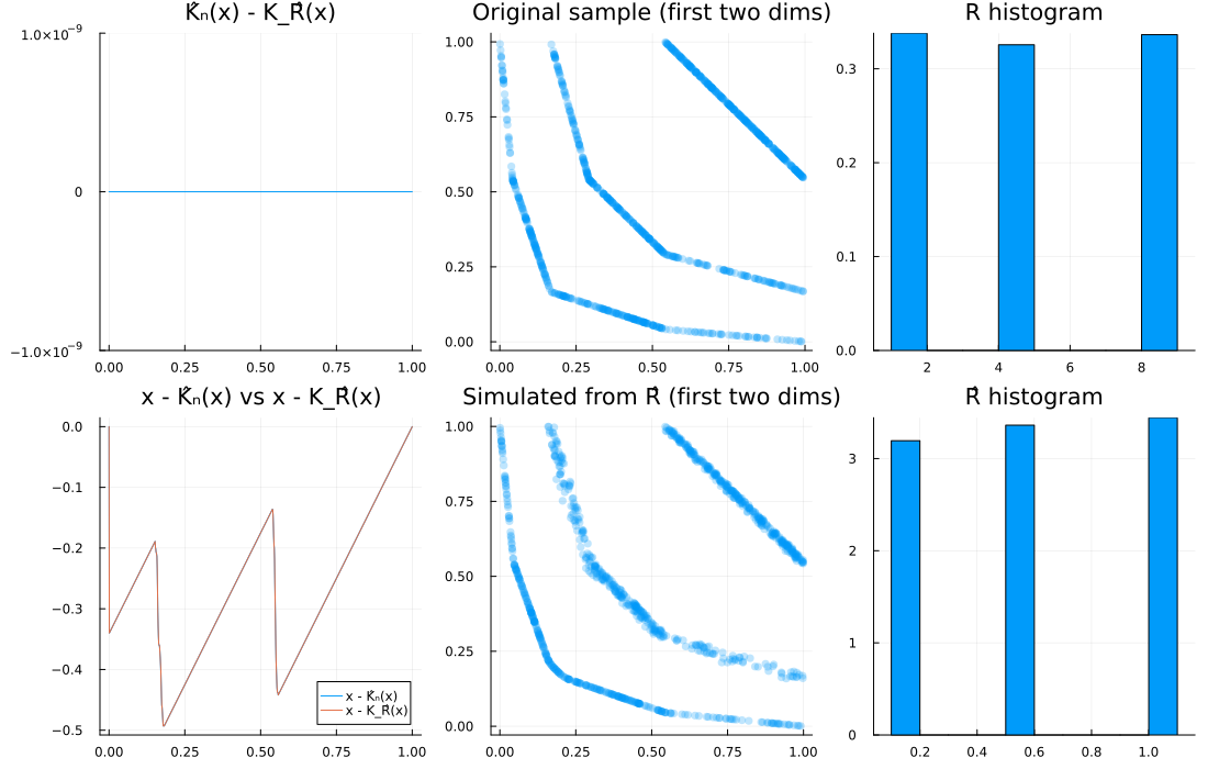 This example recalls and implements a practical, nonparametric way to estimate the radial (mixing) distribution R that underlies a d-Archimedean copula by inverting a link between the kendall distribution and the radial part [42] [43], and applying this inversion to the empirical Kendall distribution. Suprisingly, a triangular recursion appears that maps empirical kendall atoms to radial atoms: see, in particular, [37]. We’ll: