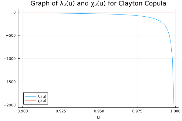 plot(0.9:0.001:0.999, Base.Fix1(λᵤ, C); xlabel="u", label="λᵤ(u)", title="Graph of λᵤ(u) and χᵤ(u) for Clayton Copula")